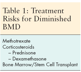 Bone health in both childhood and adult cancer survivors is receiving increased attention. The American Society of Clinical Oncology (ASCO) recommends that “cancer survivors at risk for bone and joint problems, especially survivors of breast and prostate cancers and childhood leukemia, can lower their risk by not smoking, eating foods rich in calcium, participating in regular physical activity, and limiting the amount of alcohol they drink.”[1]