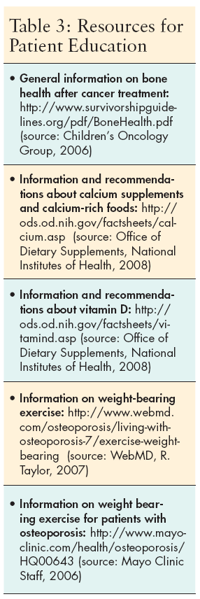 Studies confirm that as many as 21% to 39% of childhood cancer survivors may be at risk of diminished BMD.[15] The asymptomatic nature of this condition makes it critical that nurses utilize appropriate screening to identify patients who may have osteopenia or osteoporosis. Furthermore, knowledge of the interventions to treat diminished BMD will allow the nurse to provide appropriate care and will help to ensure that long-term skeletal complications such as fracture do not occur. A lifetime of healthy bones begins in childhood. For children at risk for diminished BMD, nurses are key advocates of a strong, healthy skeleton.
