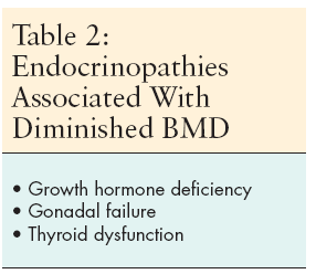 It is important for nurses to also be aware of appropriate interventions for patients found to have osteopenia or osteoporosis at screening. Dietary counseling, use of calcium and vitamin D supplements, and instruction about appropriate weight-bearing exercises should be made available to patients with osteopenia (Table 3). For the more serious condition of osteoporosis, referral to endocrinology should be considered, and pharmacologic intervention, including with bisphosphonates, may be necessary.[17] Patients with complicated medical conditions, such as a history of renal calculi, may need coordination of specialty care to treat diminished BMD safely.