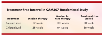 The overall response rate (83% alemtuzumab, 55% chlorambucil) and complete response rate (alemtuzumab 24%, chlorambucil 2%) both significantly favored alemtuzumab (P < .0001). After a median follow-up of approximately 25 months, progression-free survival (PFS) favored the alemtuzumab group (HR 0.58, P = .0001), as did time to alternative treatment (23.3 months alemtuzumab, 14.7 months chlorambucil, P = .0001). The treatment-free interval was more than double in the alemtuzumab group (see Table).