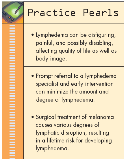 There are very few data in the medical literature regarding the incidence of lymphedema in melanoma patients, as much of the literature discusses lymphedema immediately following breast cancer surgery and pertains to upper-extremity lymphedema. Lower- extremity lymphedema poses a special challenge to the melanoma patient because it can significantly impact mobility and predisposes the patient to further potential complications such as infection.