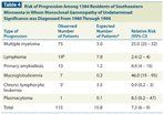 In other series. Similar findings have been reported in a Swedish study of 64 patients with MGUS.[22] In another group, 13 of 128 patients with MGUS developed a malignant disease during a median follow-up of 66 months.[23] In another study, 6.8% of 335 patients with MGUS progressed during a median follow-up of 70 months.[24] In a group of 1,324 patients with MGUS in North Jutland, Denmark, malignancy caused death in 97 patients, compared with 4.9 deaths expected.[25] In the Danish Cancer Registry, 64 new cases of malignancy were found among 1,229 patients with MGUS (5 expected; relative risk [RR], 12.9).[26] In a series of 504 Icelandic patients with MGUS, a related malignancy developed in 51 (10%) after a median follow-up of 6 years.[27]