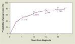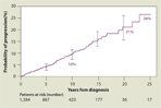 In a southeastern Minnesota population-based study. In order to eliminate the bias that occurs with referral populations, we conducted a population-based study of 1,384 patients with MGUS from the 11 counties of southeastern Minnesota who were evaluated from 1960 to 1994.[21] The median age at diagnosis of MGUS was 72 years (in contrast to 64 years for the cohort of 241 referred patients). These patients were observed for a total of 11,009 person-years (median, 15.4 years; range, 0 to 35 years). MM, AL amyloidosis, lymphoma with IgM serum protein, WM, plasmacytoma, or chronic lymphocytic leukemia (CLL) developed in 115 patients (8%) during follow-up (Table 4). At 10 years, 10% had progressed; at 20 years, 21% had progressed; and at 25 years, 26% had progressed – approximately 1% per year (Figure 3). Patients were at risk for progression even after 25 years of follow-up. The 115 patients with progression to a plasma cell disorder was 7.3 times the number expected on the basis of the incidence rates in the general population. It must be emphasized that patients are at risk for progression of MGUS even after more than 25 years of observation.