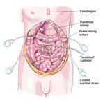 In order to initiate hyperthermic intraoperative intraperitoneal chemotherapy, a series of tubes and drains (four drainage tubes and a single inflow catheter) must be placed within the peritoneal cavity through the abdominal wall (Figure 1). To prevent leakage of these tubes as they exit the abdominal skin, a purse string suture is used. Generally, the inflow catheter is placed at a site thought to be at highest risk for recurrent disease, because the greatest heat will be generated at this site.