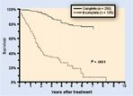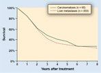 Formal institutional review board protocols should not be required for the treatment of debilitating ascites, in light of the marked quality-of-life benefits demonstrated by McQuellon and colleagues.[ 27] Also, long-term survival of patients with peritoneal surface malignancy and a low peritoneal cancer index has been established. The survival of patients with resected liver metastases has been compared to that of patients with complete cytoreduction from carcinomatosis.[ 28] Indeed, a nearly identical survival has been shown for these two groups (Figure 12). If liver resection for metastases has been accepted as standard of practice in the absence of phase III studies, perhaps this favorable comparison of treatment outcome suggests that further phase III studies may not be necessary for colorectal carcinomatosis. The ethical implications of these comparisons require careful thought.