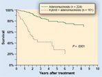 In these patients, if a CC-1 cytoreduction is possible, eradication of microscopic residual disease by intraperitoneal chemotherapy determines long-term outcome. Survival is significantly correlated with the mucinous tumor morphology (adenomucinosis vs hybrid plus adenocarcinoma, Figure 9) and the CC score (Figure 10). In contrast to most studies in gastrointestinal cancer patients, the peritoneal cancer index and lymph node involvement are not determinate prognostic factors in patients with peritoneal dissemination of appendiceal mucinous tumors.