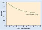 A phase III, prospective randomized study by Verwaal and colleagues in 105 patients deserves special attention.[ 11] After cytoreductive surgery and peritonectomy, 54 patients were treated with heated intraoperative intraperitoneal chemotherapy with mitomycin. In 51 patients, the administered treatment was the standard of care in Holland, a 5-FU/leucovorin regimen. Analyzing the data by an intent- to-treat principle at a median follow- up of 21.6 months (range: 3-44 months), 30 patients were alive in the experimental arm and 20 in the control arm. The Kaplan-Meier survival analysis showed a mean survival of 22.4 months for patients receiving the combined treatment. The 2-year survival was 43% in the experimental group and 16% in the systemic chemotherapy group (P = .032).