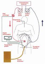 A perfusion circuit is necessary to maintain a temperature of approximately 41.5oC within the peritoneal cavity (Figure 3). Inflow and outflow tubes are connected to roller pumps and a heat exchanger. A heater/cooler, which maintains a water temperature of 48oC flowing through the heat exchanger, is part of the apparatus. For most drugs, a 90-minute perfusion is indicated to achieve a maximal cytotoxic effect.