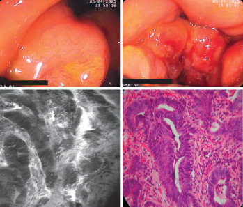 Advanced adenocarcinoma of the stomach. Top: conventional endoscopic views. Bottom: confocal endomicroscopic view (left) and histologic appearance of tumor tissue (right) showing good correspondence. Figures courtesy of Dr. Ralf Kiesslich, University of Mainz.