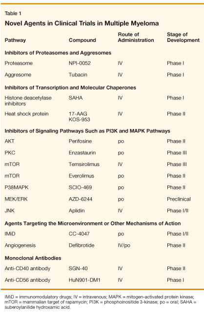 The future holds many more challenges for the treatment of MM. Overcoming these challenges will include combinations of agents that achieve higher responses and longer survival, individualized therapies that are based on genetic and molecular abnormalities present in MM patients, and clinical trials to test the benefit of novel agents in comparison and in addition to high-dose chemotherapy supported by stem cell transplantation, as well as other conventional approaches. Together, these therapies should lead to higher response rates, more durable duration of response, less toxicity, and prolonged survival, making MM an increasingly chronic and treatable disease.