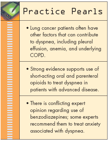 There is conflicting expert opinion regarding use of benzodiazepines; some experts recommend them to treat anxiety associated with dyspnea[13,14]; others claim that use of an anxiolytic is not supported for relief of cancer-related dyspnea.[9,15] In some patients, a trial of a benzodiazepine may be reasonable.
