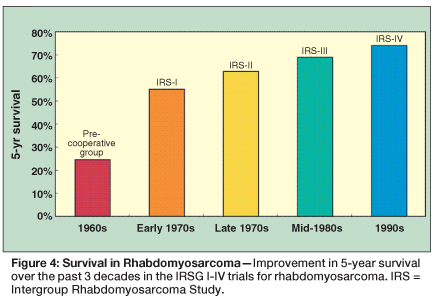 Successive IRSG studies have refined multimodality therapy to maximize survival while decreasing early and late toxicity (Figure 4). IRS-I through IRS-III reduced or eliminated radiation therapy for a subset of patients with low-risk ERMS without compromising survival.[39] Surgery has been modified to preserve the bladder, reduce aggressive resection of vaginal rhabdomyosarcoma, and eliminate retroperitoneal lymph node dissection for boys < 10 years of age with paratesticular primary tumor and no evidence of retroperitoneal lymph node involvement.[40-42]