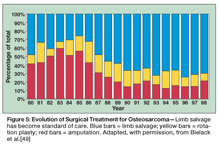 In the 1960s, localized osteosarcoma of an extremity was treated with amputation alone, and more than 80% of these patients died of distant metastatic disease.[45] In the mid-1980s, the benefit of adjuvant chemotherapy with cisplatin, doxorubicin, and high-dose methotrexate was demonstrated, and these agents form the backbone of chemotherapy today.[46] Neoadjuvant chemotherapy followed by surgical resection and additional chemotherapy results in a 3-year EFS rate of 71% for patients with localized disease and a 5-year EFS rate of 46.7% for those with metastatic disease at diagnosis.[47] The goal of surgery-en bloc tumor removal with adequate margins-initially required amputation of the involved limb. However, limb salvage can be performed in most cases, with comparable local control (Figure 5).[48,49]