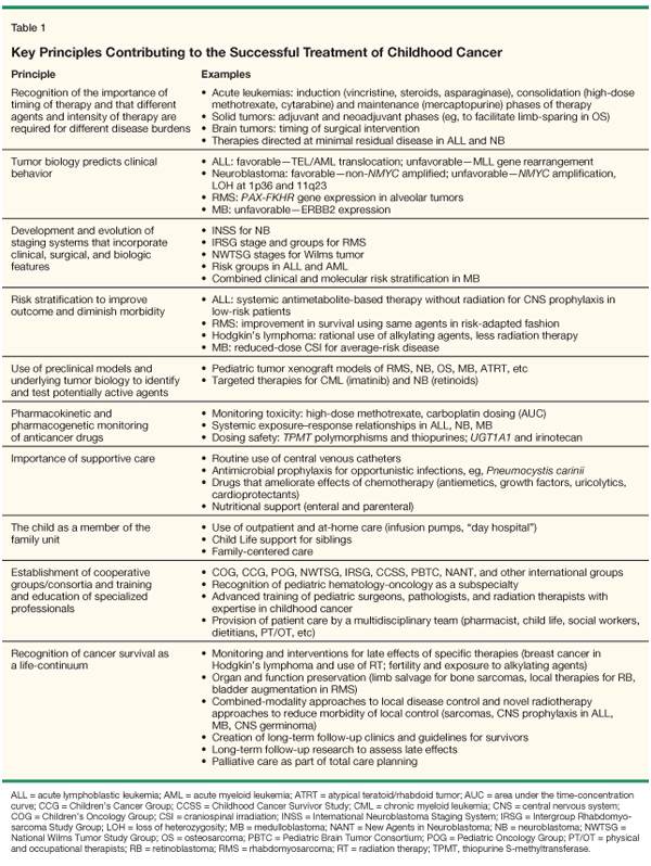 The international community has made significant contributions to this success. Collaborative pediatric oncology research models have also laid the foundation for research alliances for the treatment of asthma, cystic fibrosis, AIDS, and other chronic childhood diseases. Further, fundamental principles gained through protocol-based treatment of pediatric cancer have translated to improved management of adult cancers. These key principles are summarized in Table 1 and further elaborated below.