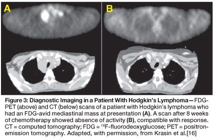 Most contemporary Hodgkin's lymphoma regimens use a combined-modality approach with chemotherapy and radiation. There are, however, instances in which only radiation, or chemotherapy alone may be considered. Advances in treatment have reduced the prognostic importance of age, sex, histologic subtype, stage, and B symptoms. The response to initial therapy is increasingly used to determine subsequent therapy. Diagnostic imaging advances have obviated the need for staging laparotomy and lymphangiography. High-resolution computed tomography (CT) and magnetic resonance imaging (MRI) have revolutionized staging. Positron-emission tomography (PET) scans can sensitively assess the proliferative activity in tumors through the uptake of 18-fluoro-2-deoxyglucose (FDG) and assess tumor response after treatment to help guide additional therapy. (Figure 3).[15,16] Prospective trials of FDG-PET in pediatric Hodgkin's lymphoma are ongoing.