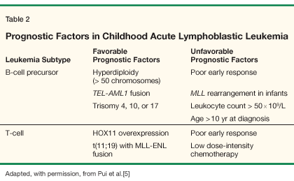 Clinical trials have progressively refined therapy on the basis of a multitude of prognostic factors related to the host or the leukemic cell (Table 2). These factors and the heterogeneous nature of ALL have generated a variety of complex treatment protocols.[5-7] Improved treatment has eliminated previous prognostic factors like male sex and T-cell ALL. We also now understand that some treatment failures reflect suboptimal drug dosing in patients with specific genetic polymorphisms of drug-metabolizing enzymes, transporters, receptors, or drug targets. DNA microarrays for global gene-expression profiling of leukemic cells can predict immunophenotype, treatment response, and relapse and are becoming an important tool in refining the classification of ALL. Moreover, these microarrays can be used to identify novel molecular therapeutic targets, as in the case of FLT3 inhibitors.[8]