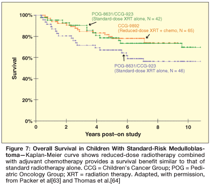As shown in Figure 7, the addition of chemotherapy has provided a further survival benefit and allowed reduction of the CSI dose for average-risk disease (complete resection with no evidence of metastasis at diagnosis).[63-65] After further refinement of chemotherapy, average-risk patients had 5-year EFS rates > 80% in two recent large trials.[65,66] The SJMB96 regimen (surgical resection and radiation followed by four cycles of high-dose chemotherapy with autologous stem cell support) substantially improved survival for high-risk patients.[66] Further advances will require development of less toxic, more specific therapies based on a thorough understanding of tumor biology.