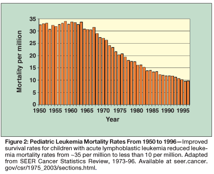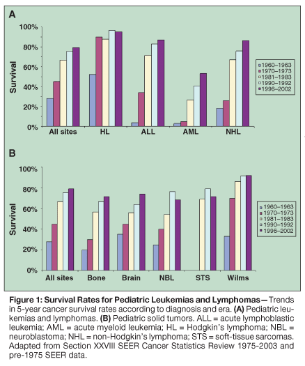 Cancer is the second leading cause of death (after accidents) in children and adolescents in the United States despite significant progress in diagnosis, treatment, and survival.[1] Mortality rates have declined approximately 2% per year over the past 3 decades, and survival rates for many childhood cancers have greatly improved (Figure 1). The overall 5-year survival rate for childhood cancer now exceeds 79%.[2] Most notable is the progress in treating acute lymphoblastic leukemia (ALL), which represents about a third of all cases of pediatric cancer (Figure 2). Improved critical care, infectious disease management, and nutritional support and the widespread use of central venous catheters have increased survival overall for children with malignancies. Approximately 1 in every 250 adults is expected to be a childhood cancer survivor by 2010. The potential social, economic, and medical impact of this advance is second only to that of the treatment of adult breast cancer.[3]