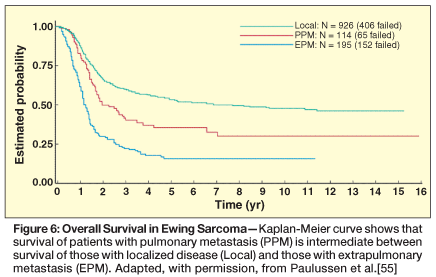 Before the introduction of systemic chemotherapy, few patients survived Ewing sarcoma. The Intergroup Ewing Sarcoma Study (IESS) introduced the first successful combined-modality therapy.[54] Another major contribution was the principle that the primary tumor site dictates the local control measure-for example, complete surgical removal of tumors in expendable bones (rib, clavicle, fibula). Risk-adapted irradiation of the primary site is based on the degree of resection and the response to chemotherapy. In addition, irradiation of pulmonary metastasis may improve survival in a subset of patients, as shown in Figure 6.[55] More recently, ifosfamide and etoposide were shown to benefit patients with high-risk features.[56] More than 70% of localized Ewing sarcoma is curable with combined therapy. Metastatic disease remains a challenge, and high-dose chemotherapy and immunotherapy regimens are under investigation.
