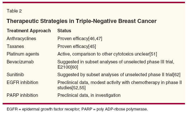 Although triple-negative breast cancer is associated with a generally poor breast cancer–specific outcome, it is not resistant to chemotherapy (Table 1). In the adjuvant setting, retrospective review of a subset of patients treated on Cancer and Leukemia Group B (CALGB) 9344 suggested that the benefit of a taxane added to an anthracycline was primarily among patients whose disease overexpressed HER2 or were double-negative (ER/HER2), most of which are likely to be basal-like.[45]