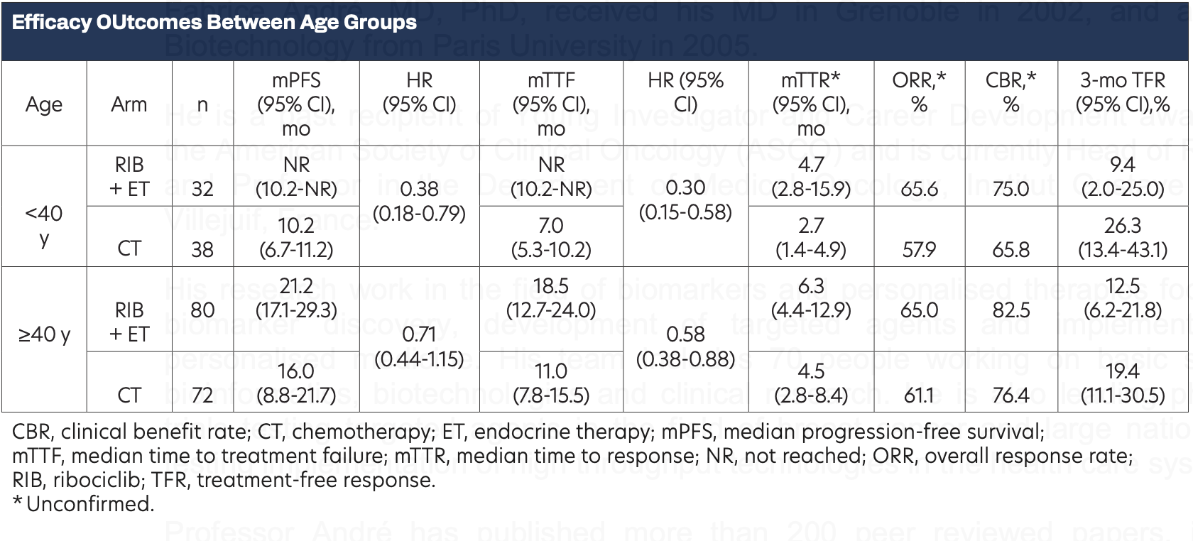This analysis showed a clinically meaningful PFS benefit and improved secondary outcomes with 1L RIB + ET vs combo CT, and similar treatment responses in patients aged less than 40 years and older than 40 years with aggressive HR+/HER2– ABC. This analysis supports RIB plus ET as a preferred treatment option in patients who are younger (< 40 years) and (≥ 40 years).