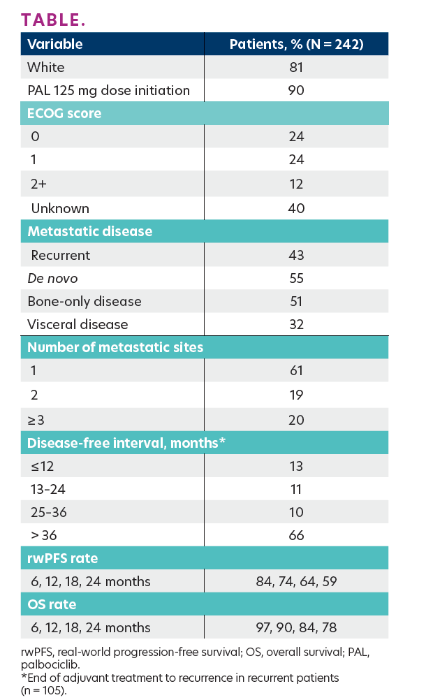 The study used the Syapse Learning Health Network, a longitudinal database that collects cancer care data from the entirety of a patient’s journey from US health systems across 25 states, 457 hospitals, and among 1317 community oncologists. Death data were captured using multiple sources. Patients aged 18 years and older with HR+/HER2– a/mBC who initiated 1L PAL + AI were evaluated from February 2015 through July 2019, with 6 months or more of potential follow-up. Patients were followed from treatment initiation until data cutoff (February 2020), death, or loss of contact, whichever came first. All results were descriptively summarized. Median time to event rates were obtained using Kaplan-Meier estimates.