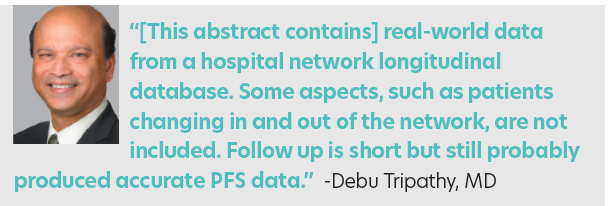 The study included 242 patients (median age, 66 years; Table). Median duration of follow-up was 22.4 months. The most common reasons for treatment discontinuation were progressive disease (26%) and intolerance/toxicity (15%); 44% of patients remained on treatment at study cutoff. Among patients with a known dose adjustment (31%), mean time to adjustment was 167.4 days; median time was 55 days. Median time to treatment discontinuation and real-world progression-free survival (rwPFS) were 23.9 (95% CI, 17.6-28.5 months) and 31.7 months (95% CI, 26.5-50.3 months), respectively. Twelve- and 24-month overall survival (OS) rates were 90% (95% CI, 87%-94%) and 78% (95% CI, 72%-84%), respectively; 25.6% of patients died during the study.
