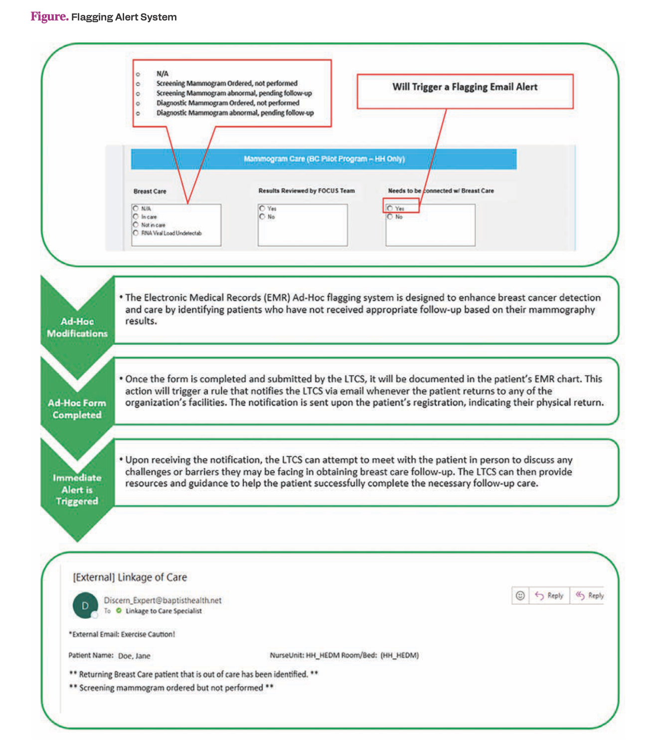 Our findings highlight significant disparities in breast cancer screening and diagnostic follow-up among minority populations in Miami-Dade County. We are developing an infrastructure to improve screening rates and a safety net for our patient population to mitigate barriers for accessing care. We educated providers at a local federally qualified health center on identifying high-risk patients. We are integrating a prediagnostic Linkage Navigator to enhance diagnostic test completion by addressing barriers and ensuring seamless linkage. We are enhancing an existing electronic flagging alert system as a safeguard, building on lessons from infectious disease screening, to identify patients needing follow-up in real-time upon returning within the health system (Figure). We are developing a dashboard to track the impact of our interventions, displaying early data from our health system transformation to reduce late-stage breast cancer diagnoses in our community.