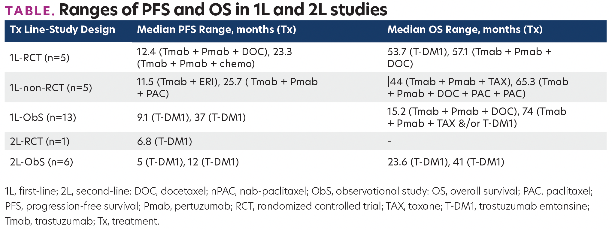 2692 citations were screened, and 38 studies were included. Eleven studies were randomized-controlled trials (RCTs; 5 in 1L, 1 in 2L, 5 in 3L+), 6 were non-RCTs (5 in 1L, 1 in 3L+), and 21 were ObSs (13 in 1L, 6 in 2L, 4 in 3L+ [note that studies with subgroups for 1L, 2L, 3L+ are double-counted]). Longer overall survival (OS) was associated with an earlier Tx line (Table). For 3L+ studies that included ERI, ERI, or trastuzumab (Tmab)+ERI led to longer OS than Tx of physician’s choice (median OS, of 11, 10, and 8.9 months, respectively). Progression-free survival was 9 months in Tmab+pertuzumab(Pmab)+ERI, 4 months in Tmab+ERI, and 3.3 months in ERI.