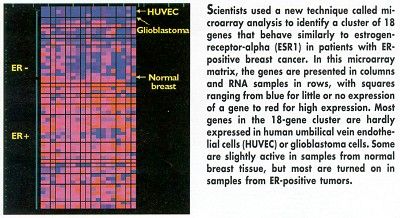 Dr. Polymeropoulos and his colleagues described the cluster in an article in The Pharmacogenomics Journal (1:135-141, 2001). He said that some activity in the cluster might be coincidental to breast cancer, but all 18 genes should be investigated as potential biomarkers for predicting how individual patients will respond to endocrine therapies such as tamoxifen (Taxol) and letrozole (Femara). "This is the beginning of customizing the treatment of breast cancer," he told ONI.