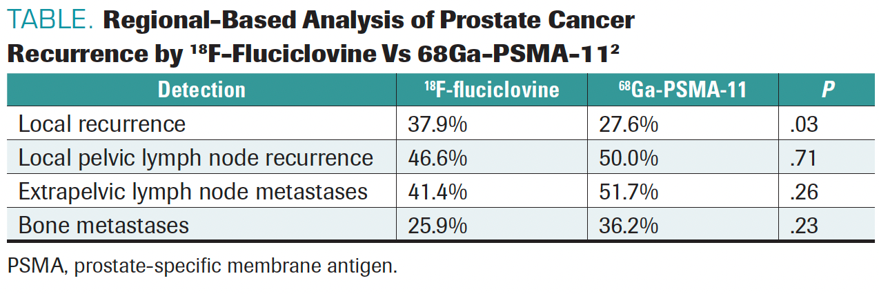 Although the 2 methods detected recurrence at similar rates overall, 18F-fluciclovine detected local recurrence in 37.9% of the overall sample of patients compared with 27.6% with 68Ga-PSMA-11. On the other hand, 18F-fluciclovine detected local pelvic lymph node recurrence, extrapelvic lymph node metastases, and bone metastases at lower rates than 68Ga-PSMA-11. However, Pernthaler and colleagues wrote that these differences were not statistically significant (TABLE).2