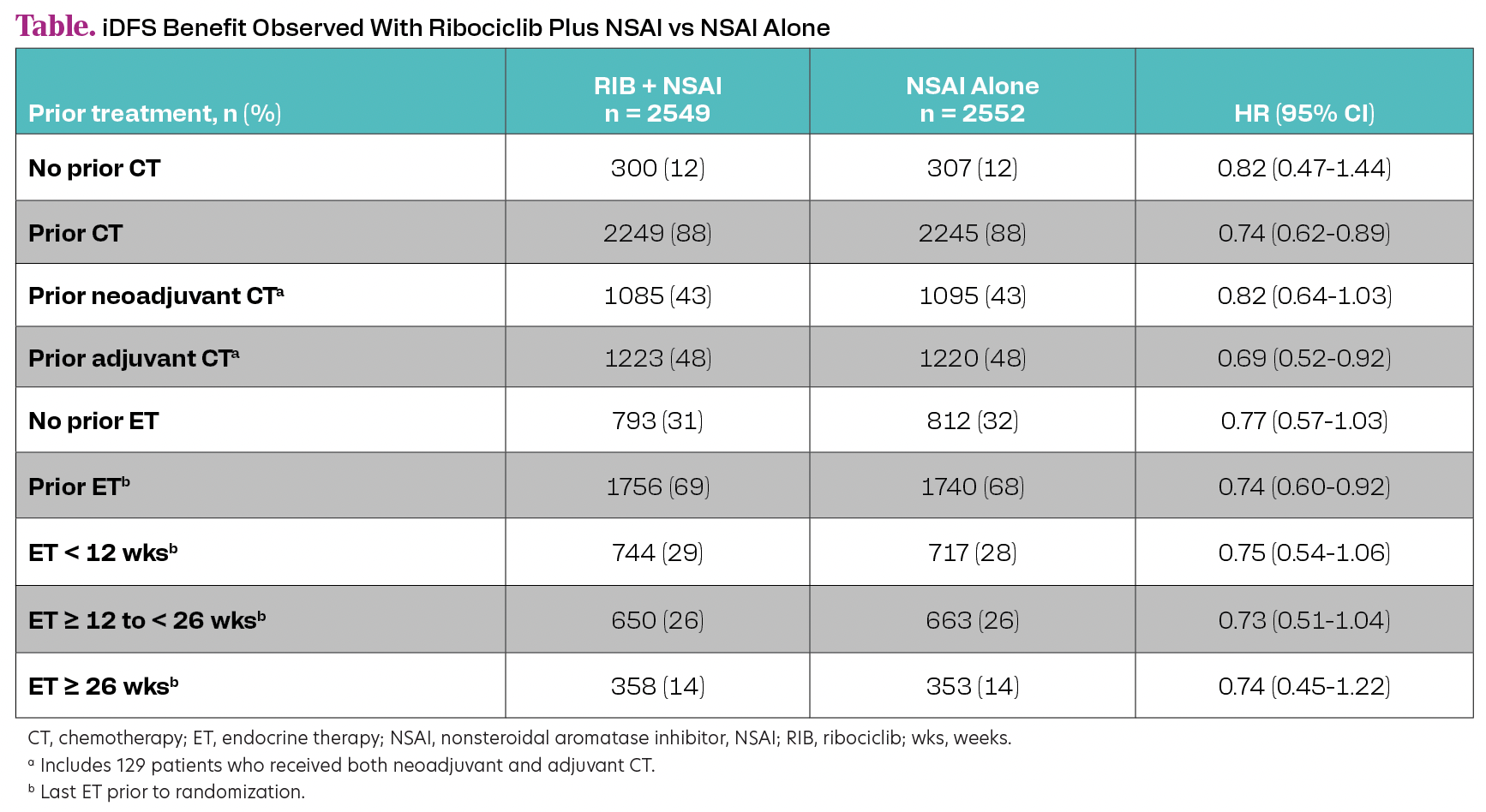 Of 5101 patients, 88% received prior CT, 43% had prior neoadjuvant CT, and 48% had prior adjuvant CT. Of 1432 patients with N0 disease at diagnosis, most had prior CT (78%). Most patients (73%) with prior neoadjuvant CT had stage III disease, while 19% with no prior CT had stage III disease. Overall, 69% of patients received prior ET (median duration of last prior ET was 3.2 months). An iDFS benefit with ribociclib plus NSAI was observed regardless of prior CT or duration of ET (Table).