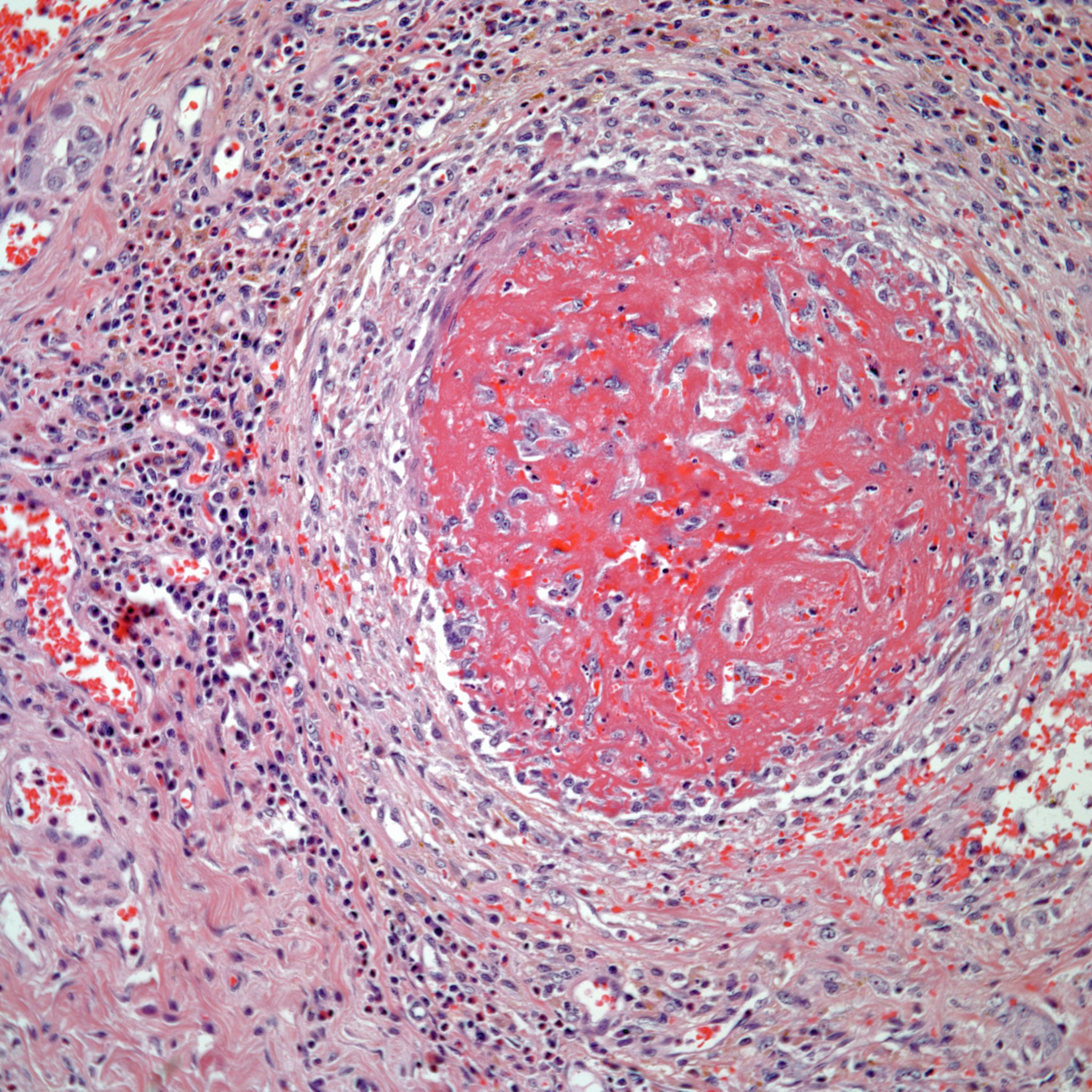 A 23-year-old man presents with a soft tissue mass in the left side of the abdomen. The patient doe not have any history of malignancy and the only relevant clinical history is that of long standing asthma. Surgical excision of the mass is performed.