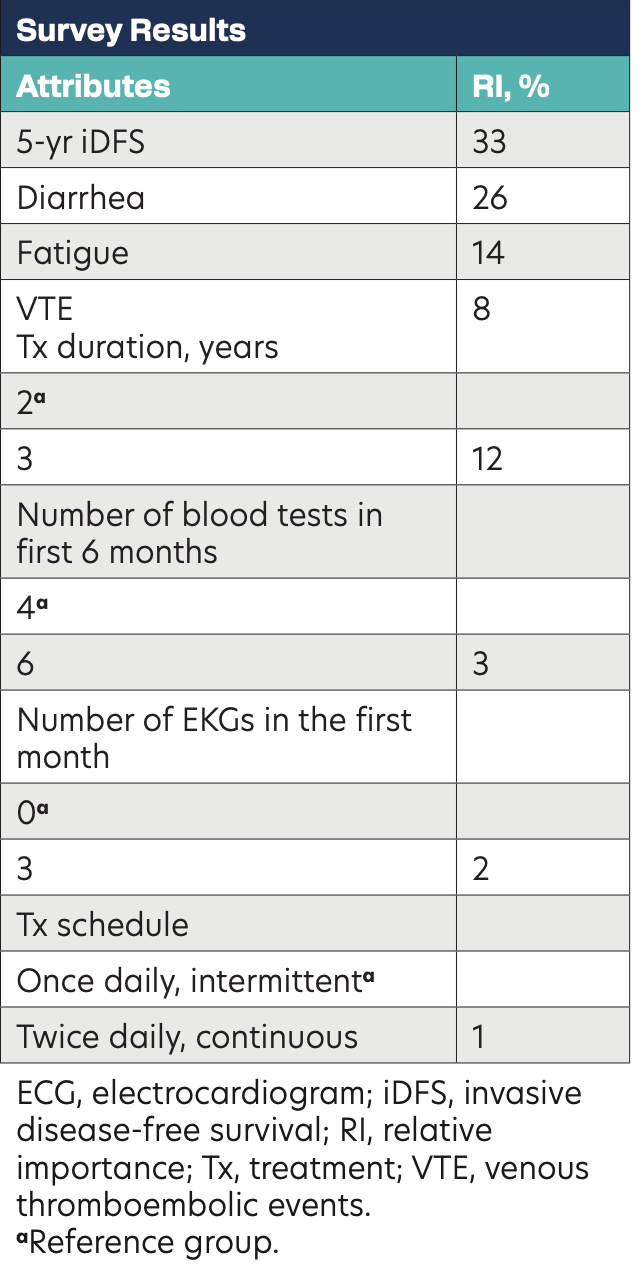 A web-based discrete choice experiment survey was conducted from January to May 2023. Patients were adult women with self-reported stage II/III HR+/HER2– EBC with or without prior chemotherapy receiving only adjuvant ET at the time of the survey. Patients selected scenarios from choice cards, each with 2 hypothetical treatment profiles. A total of 8 attributes related to efficacy (5-year iDFS), adverse effects (AEs; risk of diarrhea, fatigue, or venous thromboembolic events [VTE]), monitoring (number of electrocardiograms [EKG] or blood tests), treatment duration (2 years vs 3 years), and schedule (once daily, intermittent vs twice daily, continuous) were included. A conditional logistic regression model was used to estimate the relative importance (RI) of each attribute. Utility scores were estimated for the model with various scenarios tested.