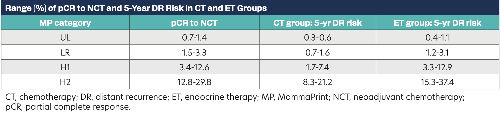 Of 901 patients with HR+/HER2– early-stage breast cancer included, 426 enrolled in NBRST (NCT01479101) received neoadjuvant CT. The remaining 475 patients were enrolled in the prospective FLEX trial (NCT03053193) with a 5-year follow-up: 181 received CT (with or without ET), and 294 received ET only. Logistic regression was used to estimate the likelihood of pCR and 5-year DR risk (including breast cancer-specific death) for CT vs ET, as a continuous function of the MP index, defined as ultralow (UL; 1.000-0.356), low risk (LR; 0.355-0.001), high 1 (H1; 0.000 to –0.569), and high 2 (H2; –0.570 to –1.000).
