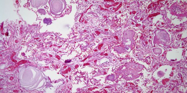 A 27-year-old woman presents with severe dyspnea. Imaging shows diffuse, bilateral infiltrates, and a biopsy is performed.