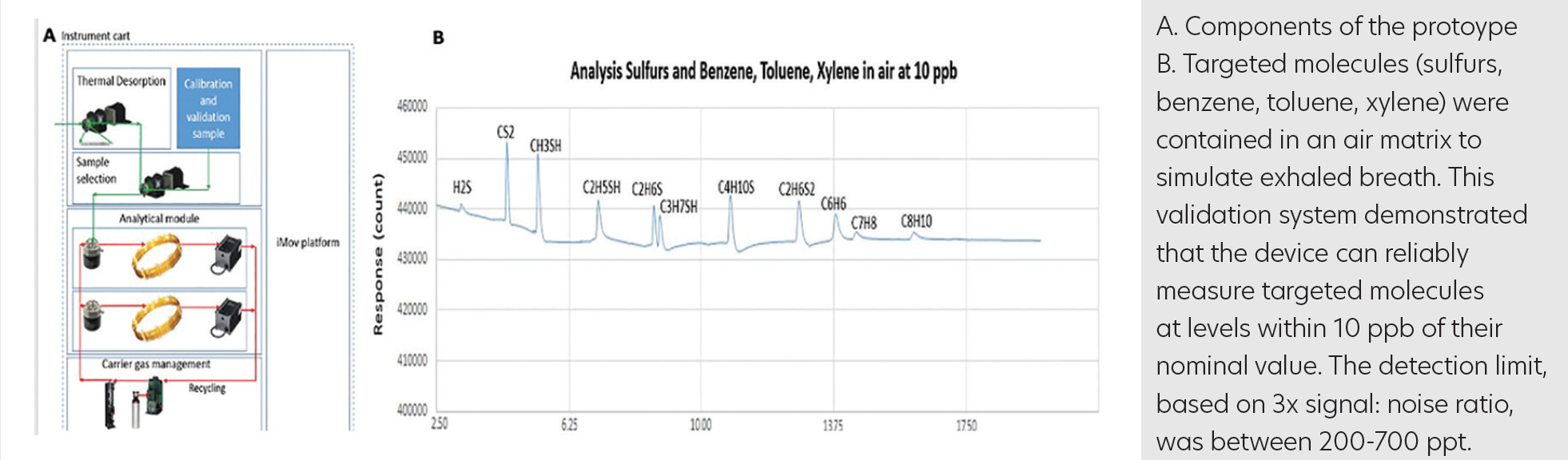 Using representative biomarkers in exhaled breath, proof-of-principle testing confirmed the sensitivity and selectivity of the sensing technology based on a proprietary gas chromatography (GC) method from eTrace Medical (patent pending). Protocol validation included testing of ASDevices technologies (pretreatment and concentrator, iMov GC platform, uInProve GC valve, and Epd sensing technologies) (Figure A). Targeted molecules (sulfur, benzene, toluene, and xylene) were contained in an air matrix to simulate exhaled breath. This validation system demonstrated that the device can reliably measure targeted molecules at levels within 10 ppb of their nominal value (Figure B). The detection limit, based on 3Å~ signal:noise ratio, was between 200 and 700 ppt. The sensitivity of the system can be further adapted via sample concentration and pretreatment.