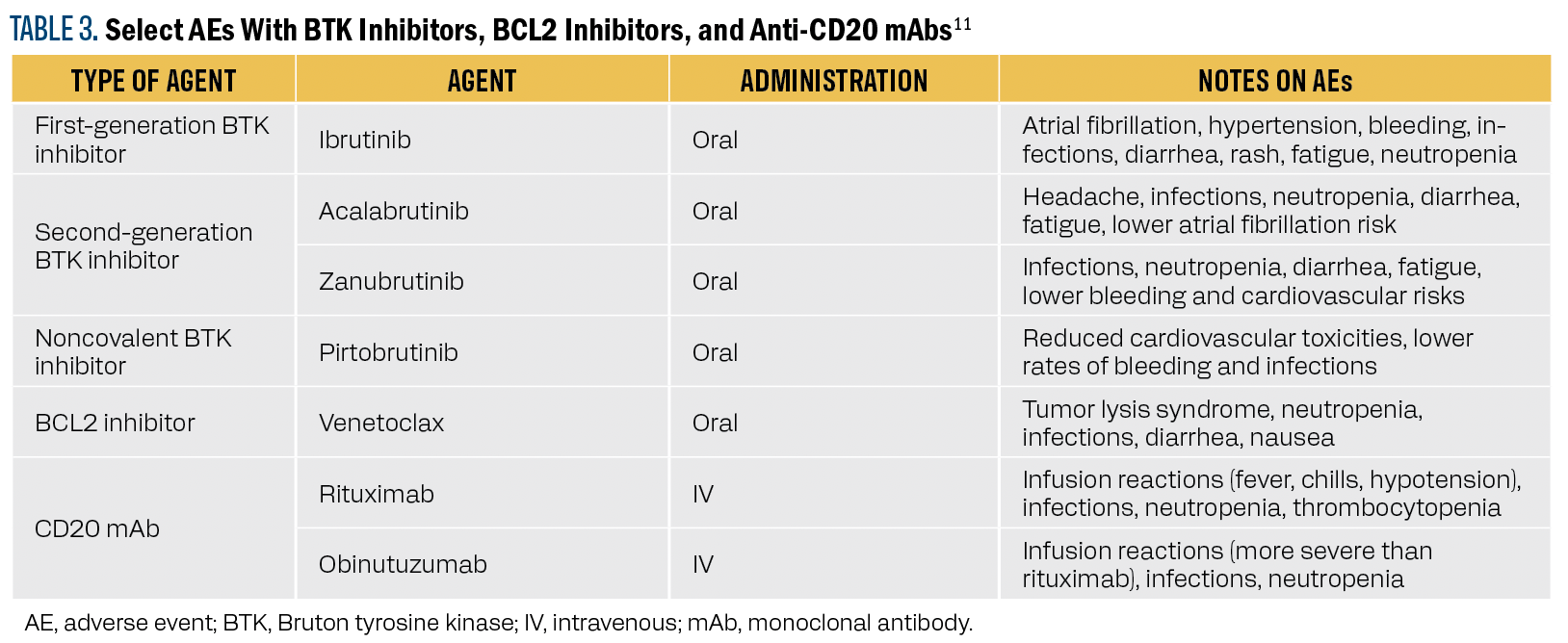Table 3. Select AEs With BTK Inhibitors, BCL2 Inhibitors, and Anti-CD20 mAbs11