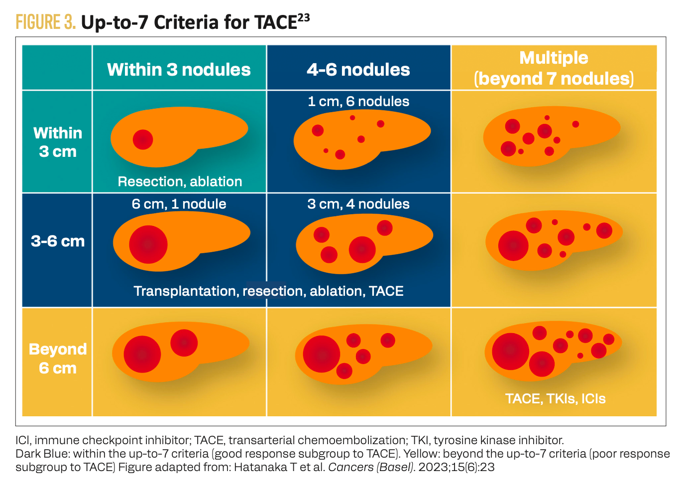 The phase 3 TALENTACE study (NCT04712643) evaluated on-demand TACE alone vs with atezolizumab plus bevacizumab in uHCC.21 Approximately half the patients evaluated in the EMERALD-1 and LEAP-012 studies had bulky disease (tumor burden beyond the up-to-7 criteria or tumor burden score higher than 6), whereas a sum of the maximum tumor diameter plus number of lesions totaling 6 or more was one of the key inclusion criteria for TALENTACE (Figure 3).19,20,22,23 The primary study end point of TACE-PFS (time from randomization to unTACEable progression, TACE failure/refractoriness, or any-cause death) was significantly improved for patients who received atezolizumab plus bevacizumab in addition to on-demand TACE (median, 11.30 vs 7.03 months; HR, 0.71; 95% CI, 0.55-0.92; 2-sided P = .009).21 The rate of grade 3 to 5 TRAEs was 63.8% vs 42.2% in the TACE plus atezolizumab and bevacizumab vs TACE alone groups, respectively.