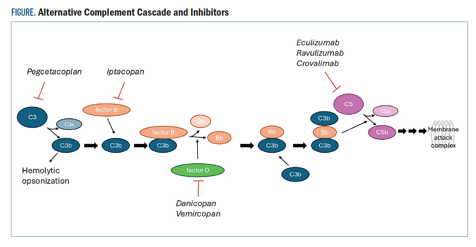 In both PNH and aHUS, overactivity in the alternative complement cascade can lead to anemia, kidney damage, and other systemic dysregulation.4,5 Several drugs have been developed targeting proteins of the alternative complement cascade to treat symptoms of PNH and aHUS (Figure). The C5 inhibitors eculizumab and ravulizumab were compared head-to-head in the 301 and 302 trials (NCT02946463 and NCT03056040, respectively).6,7 Ravulizumab demonstrated noninferiority to standard-of-care eculizumab in terms of transfusion avoidance, least-square mean (LSM) percent change in lactate dehydrogenase (LDH) levels, change in FACIT-Fatigue score, percentage of patients experiencing breakthrough hemolysis, and hemoglobin (Hgb) stabilization.