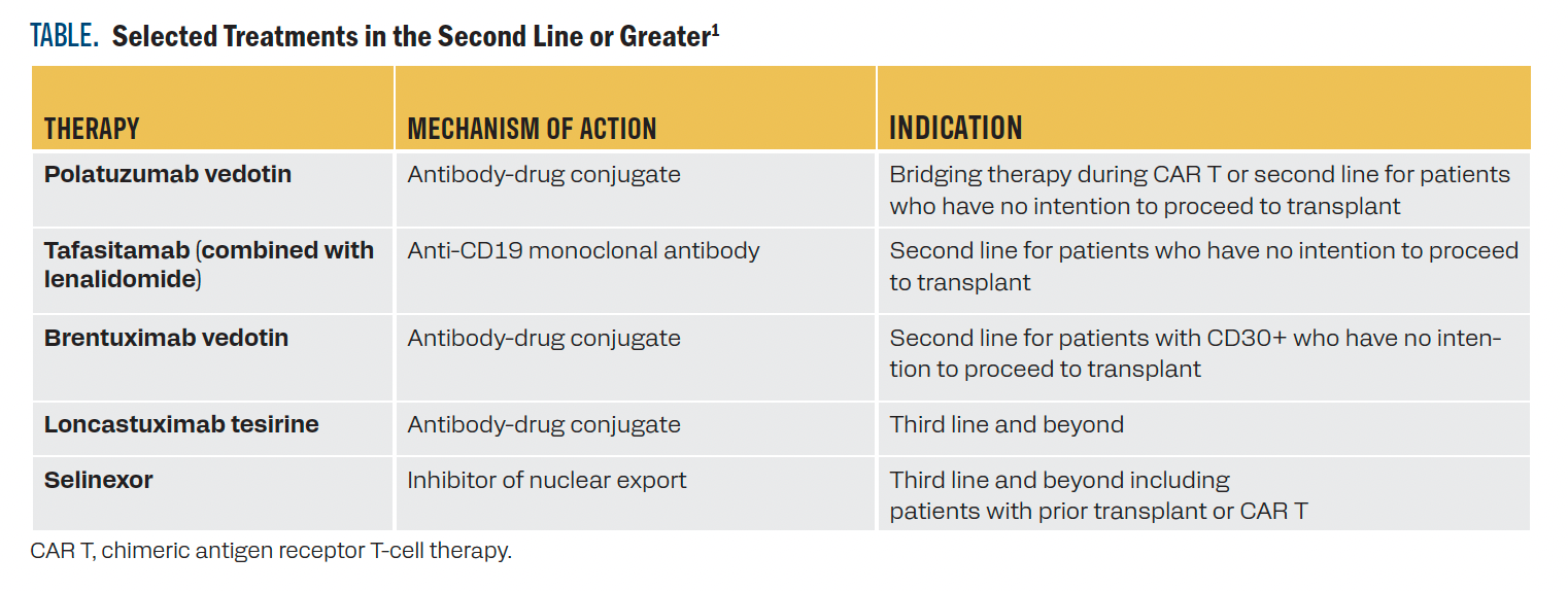 In addition to CAR T-cell therapy and bispecific antibodies, the DLBCL armamentarium includes a variety of treatments beyond chemotherapy for patients who have progressed on first-line therapy (Table).1 Brentuximab vedotin recently joined the list of second-line options after its use demonstrated improved ORR, CR, OS, and PFS when combined with lenalidomide and rituximab vs lenalidomide and rituximab alone in the ECHELON-3 trial (NCT04404283).7