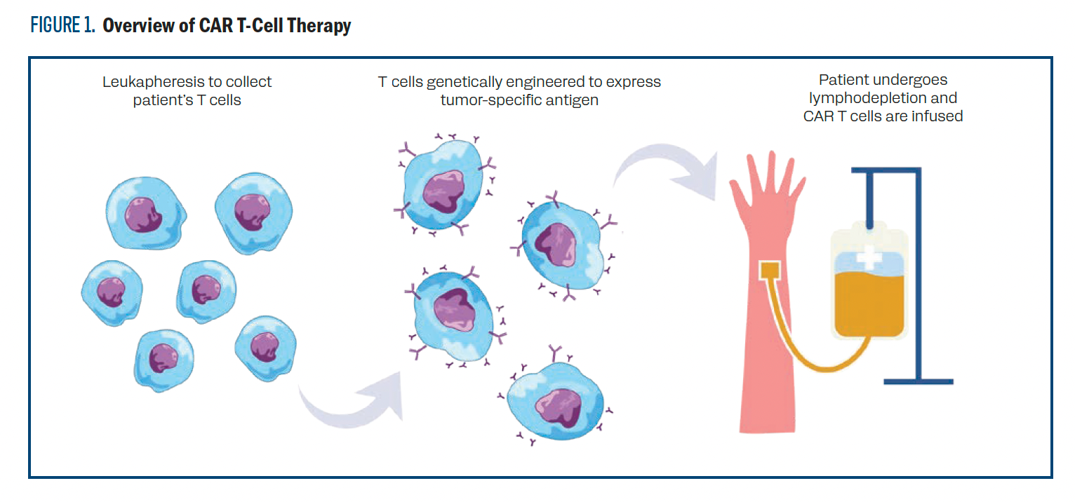 Chimeric antigen receptor (CAR) T-cell therapy aims to enhance the antitumor capabilities of the adaptive immune system by collecting a patient’s T cells and modifying them genetically to express a receptor that specifically targets an antigen expressed on the patient’s tumor cells (Figure 1).