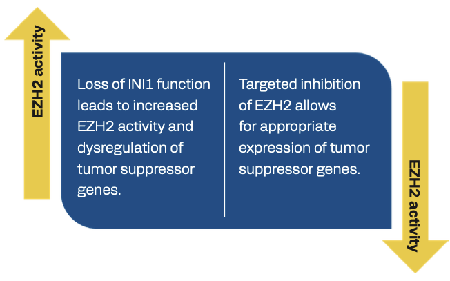 Given the ubiquity of the loss of INI1 function in ES, it should come as no surprise that the enzyme was identified as a promising target for drug development. INI1 is a tumor suppressor that inhibits the enhancer of zeste homolog 2 (EZH2) enzyme, indirectly stimulating the transcription of other tumor suppressor genes.8 Tazemetostat, a targeted medication that works as a novel inhibitor of EZH2, was developed based on an understanding of the molecular biology of ES.