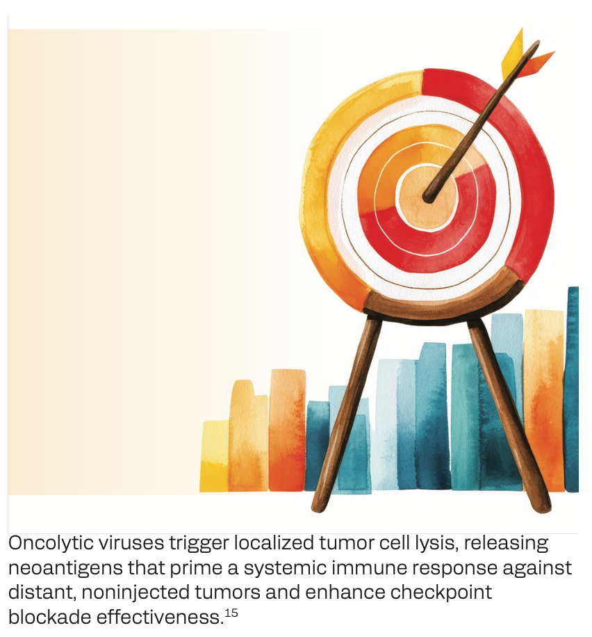 Oncolytic viruses trigger localized tumor cell lysis, releasing neoantigens that prime a systemic immune response against distant, noninjected tumors and enhance checkpoint blockade effectiveness.15