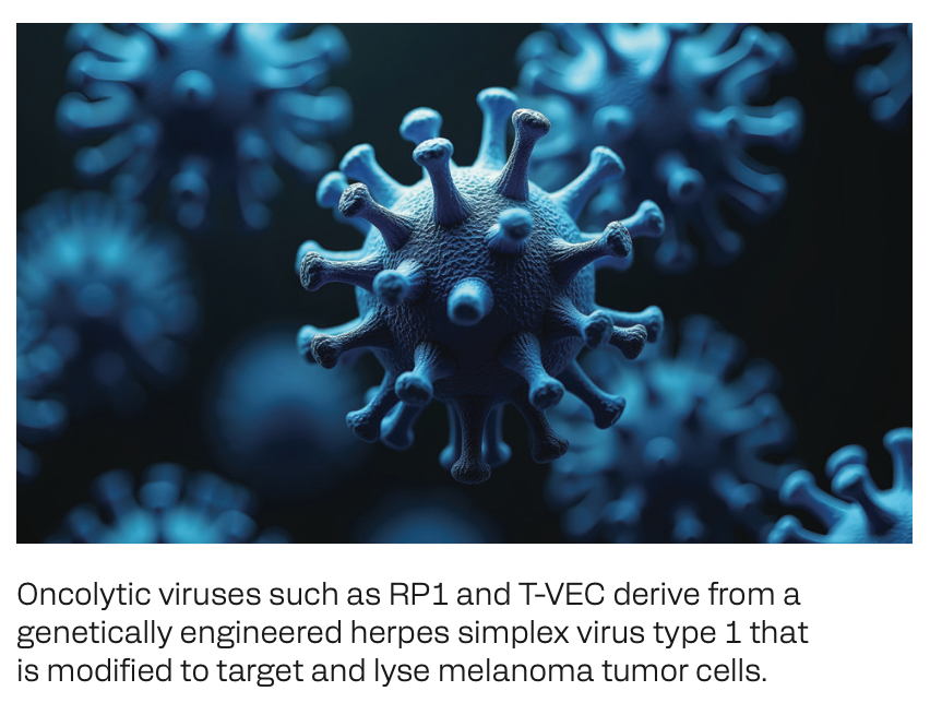 Oncolytic viruses such as RP1 and T-VEC derive from a genetically engineered herpes simplex virus type 1 that is modified to target and lyse melanoma tumor cells.