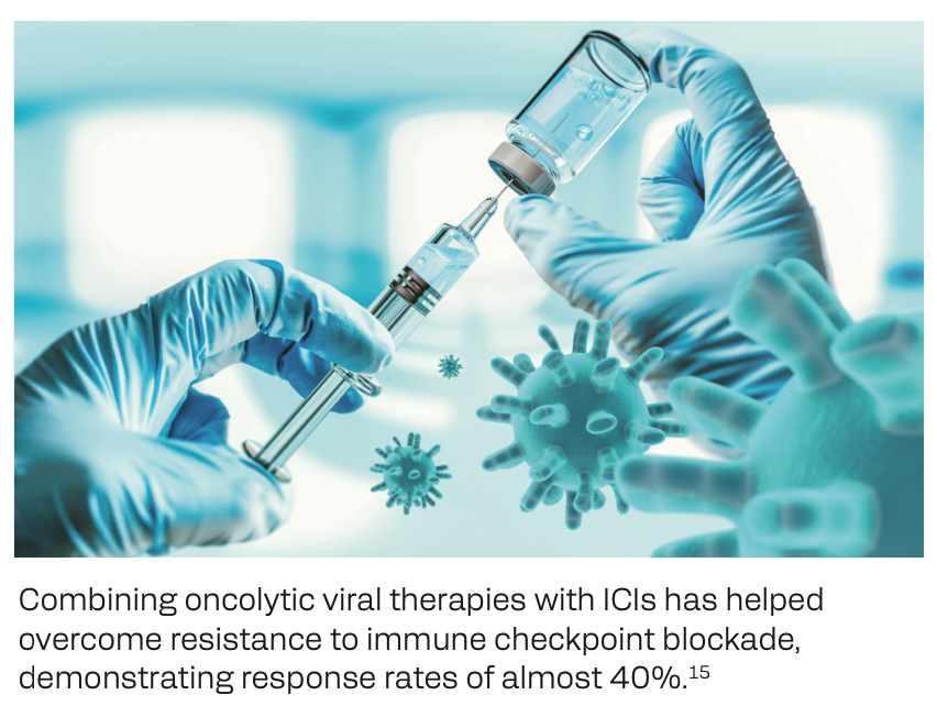 Combining oncolytic viral therapies with ICIs has helped overcome resistance to immune checkpoint blockade, demonstrating response rates of almost 40%.15