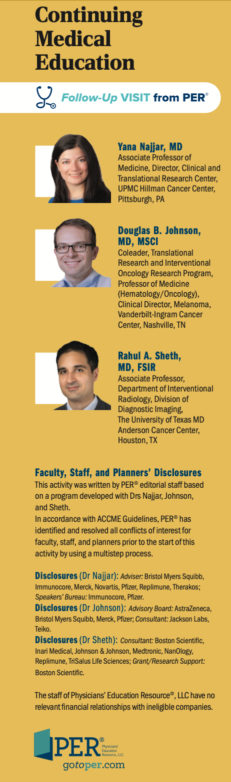 Given the expanded complexity of the therapeutic arsenal used to treat advanced melanoma, reliance on interdisciplinary collaboration outside of the multidisciplinary tumor board is paramount. By integrating the unique perspectives from interventional radiologists (IRs), medical oncologists, and surgeons alike, the optimal therapy can be better tailored to meet the unique needs of each patient.The emergence of intratumoral immunotherapies—particularly oncolytic viruses such as T-VEC and RP1—has ultimately redefined the IR’s role in treating patients with advanced melanoma. Oncolytic viruses and vaccine-based immunotherapies have become the leading focus of clinical research in advanced melanoma, outnumbering trials for all other therapeutic classes.17 Intratumoral injections offer a promising alternative and/or adjunct to systemic immunotherapies, bypassing issues with poor drug penetration and resistance, while also mounting systemic immune responses against tumors elsewhere in the body.15,17,18