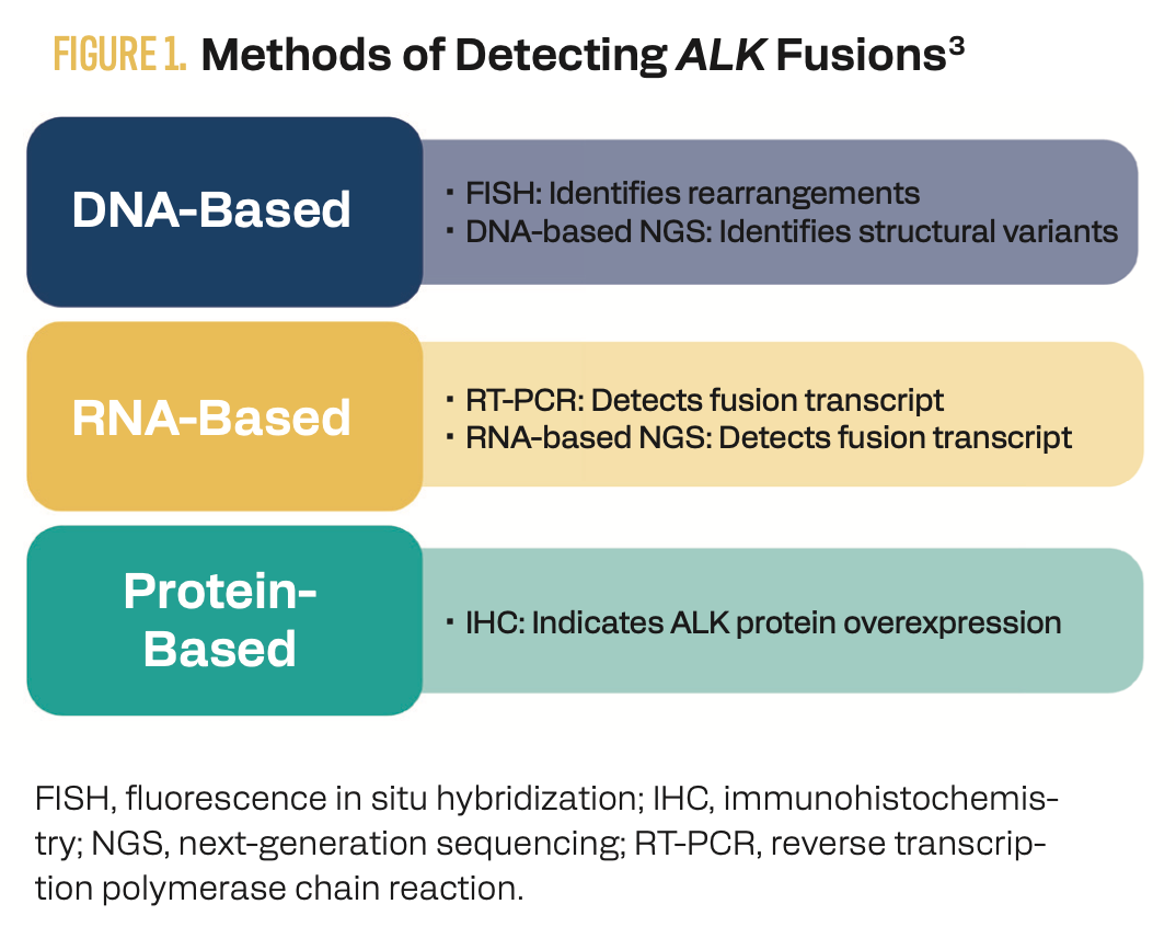 Appropriate molecular testing is critical for identifying mutations early and informing treatment decisions in metastatic NSCLC. Most ALK mutations are a result of a translocation and fusion with another gene (frequently EML4 in NSCLC), causing overexpression of the ALK tyrosine kinase.2 Previously, the standard methods of diagnosing ALK-mutated NSCLC were single-gene assays, such as fluorescence in situ hybridization, or immunohistochemistry for detecting ALK protein expression.3 However, insufficient tissue sample availability and an inability to detect less common mutations are limitations of these methods (Figure 1).