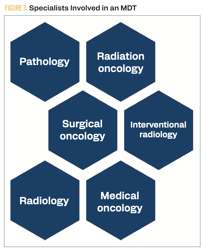 Potential barriers to the use of MDT include specialists at multiple sites, which may be alleviated using virtual tumor boards.22 Additionally, tumor boards should include regular cross-specialty case reviews to allow for discussion of complex medical oncology cases in addition to earlier-stage disease and local treatments.