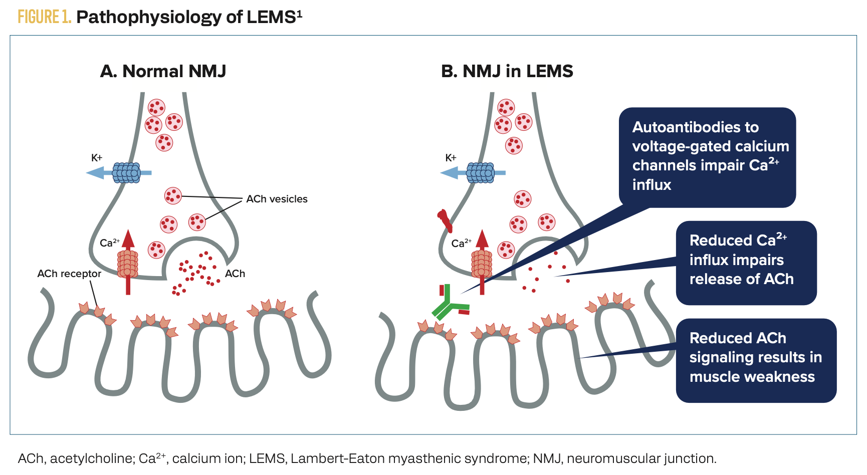 In the normal neuromuscular junction, depolarization of the nerve results in the ingress of calcium ions through voltage-gated calcium channels (VGCCs).1 This results in vesicles containing the neurotransmitter acetylcholine (ACh) to migrate to the presynaptic membrane of the nerve and release ACh, which leads to muscle contraction (Figure 1A).1 In LEMS, autoantibodies to VGCCs inhibit the influx of calcium ions, ultimately leading to reduced release of ACh and symptoms such as muscle weakness (Figure 1B).1
